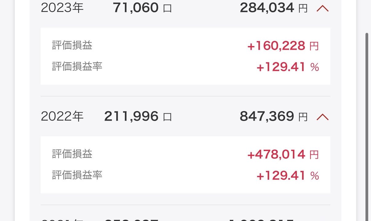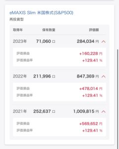 結果からお伝えしますと、2021〜2023年の約3年間に旧つみたてNISAの年間枠(40万円)をきっちり使い切る形で少額積立を行い、総投資額約131万円(再投資分を含む)が評価額約260万円超に育っています。